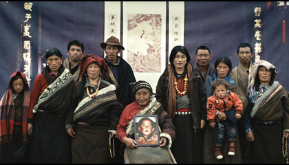 A young itinerant photographer and his assistant offer to photograph some Tibetan nomads in front of various backgrounds.